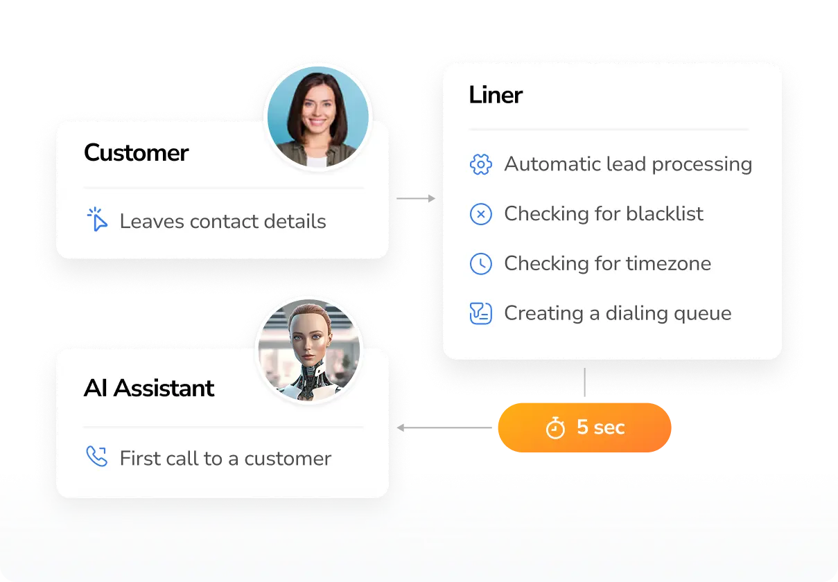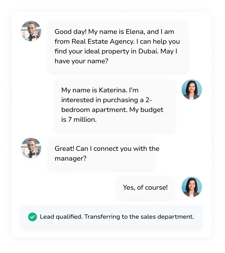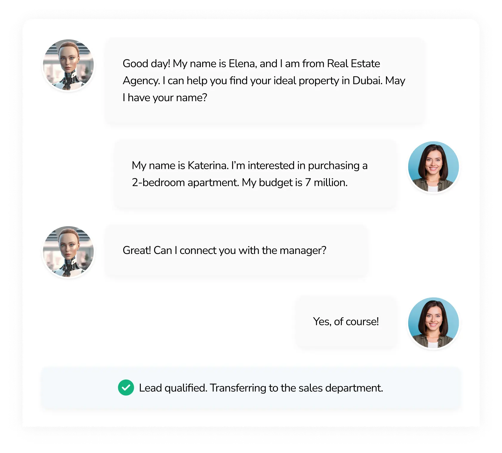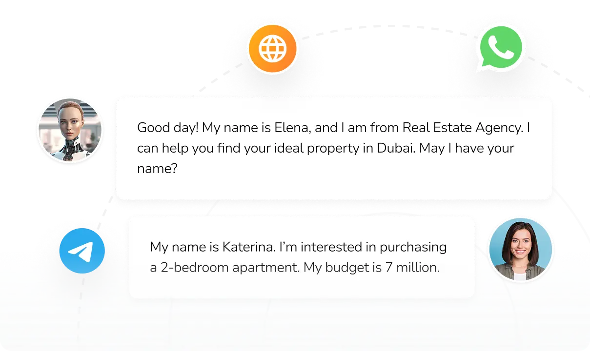 Instant lead qualification and call-back via WhatsApp, Instagram, Telegram, and Webchat.